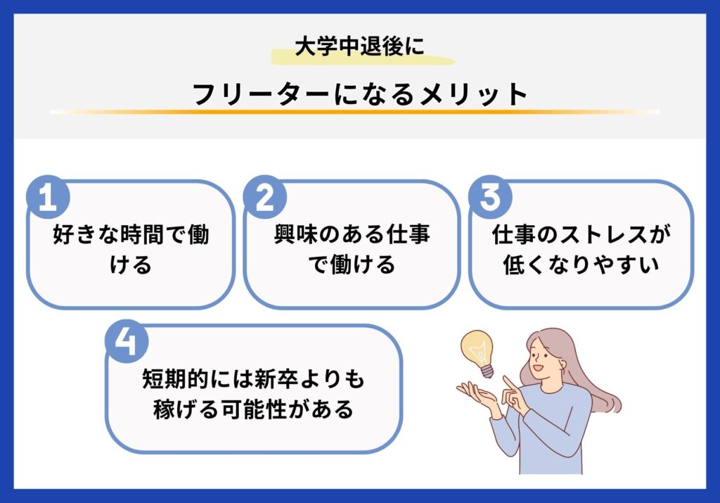 学歴不問の求人が多く、基本的なコミュニケーション能力があれば採用してもらいやすいといった点で大学中退者におすすめできます。